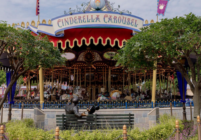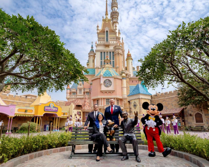 The statue depicts Walt and Mickey visiting the park decades after Walt’s idea for Disneyland and looking back on what the past 100 years have brought the company.