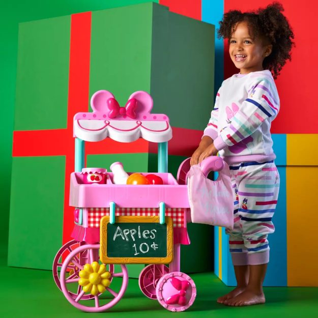 This Minnie Mouse Farmers Market Play Set can spark imaginative play. This cart rolls so little ones can take it where they want to go. It comes with 22 pieces including toy fruit, milk, and jam.