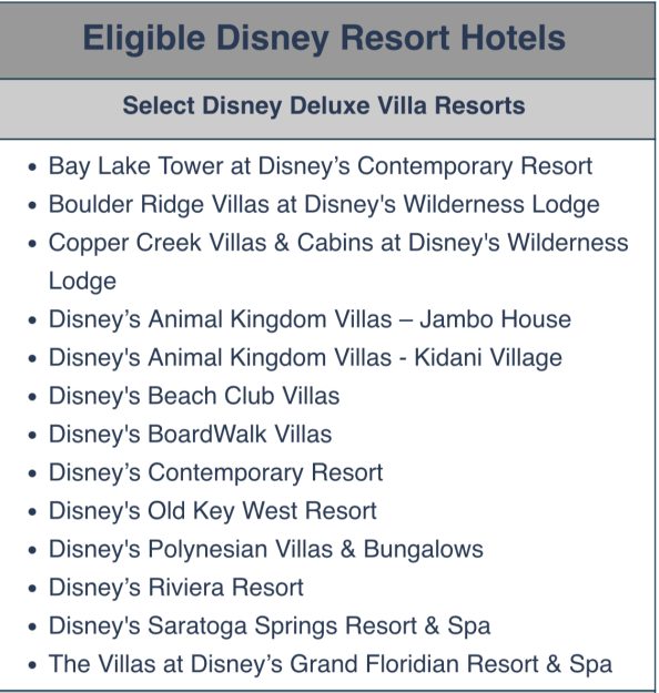 - Offer excludes the following room types: 2-bedroom suites, 2-bedroom villas, 3-bedroom villas, campsites, Cabins at Copper Creek Villas & Cabins at Disney’s Wilderness Lodge and Bungalows at Polynesian Villas & Bungalows.