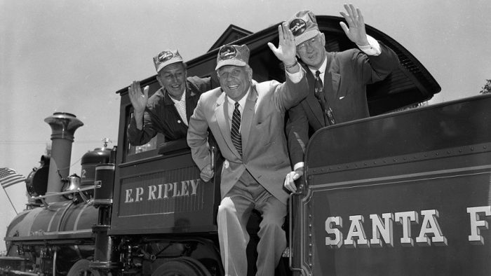 Also on the train were California Gov. Goodwin Knight and Fred Gurley, president of the real Santa Fe Railroad. All were sporting authentic-looking striped railroad engineers’ caps.