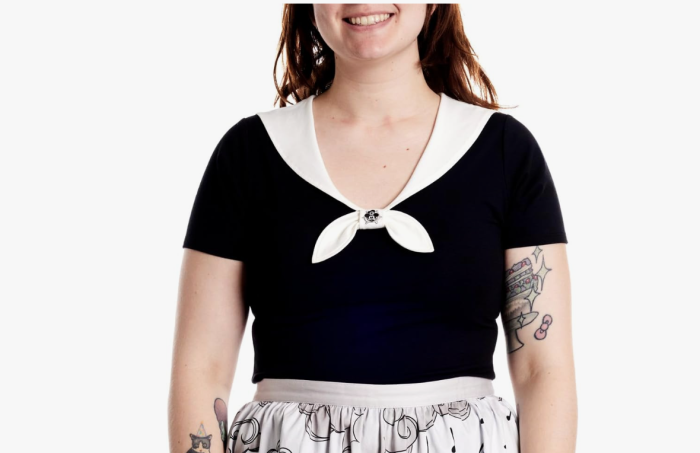 There’s a white collar with a bow in the middle and each top also comes with an enamel pin of Mickey Mouse on a ship’s anchor. It’s simple and can be styled in many ways!
