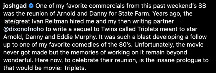 We found out that Josh Gad (everyone’s favorite, Olaf) loved the commercial so much that it inspired him to release some of the sequel script he wrote to Schwarzenegger and Devito’s 1988 box office hit, Twins. Gad titled the sequel, Triplets and included Edie Murphy as the third star! Here’s what Gad said: