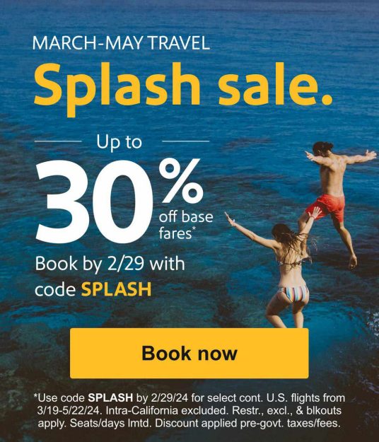 To get this deal, use code SPLASH by February 29th, 2024. The discount is good for select U.S. flights. You’ll want to jump on that fast because once those flights fill up, that’s it!
