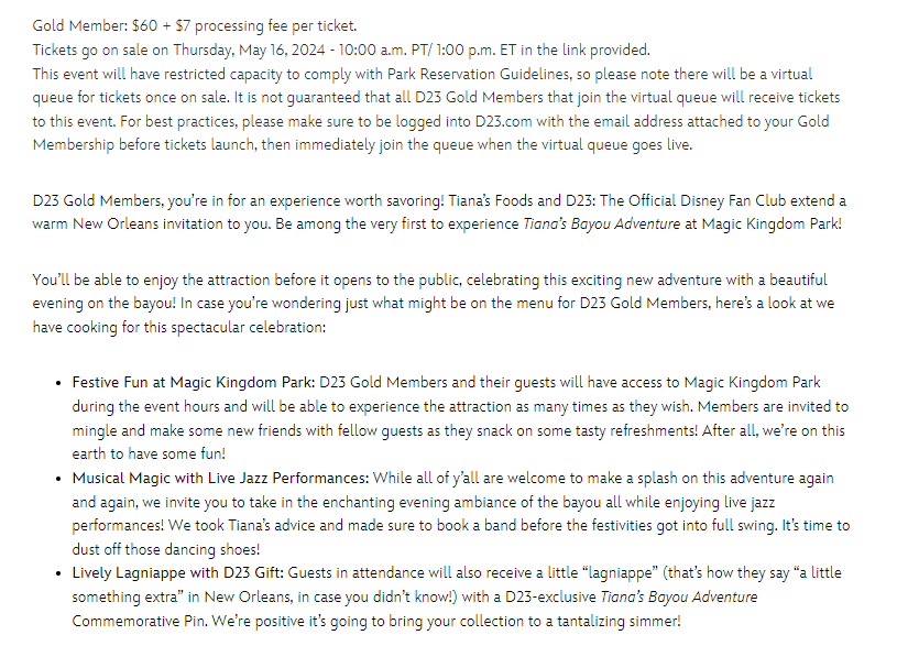 That’s not all, though! There will be a D23 Gold Member Tiana’s Bayou Adventure event held on June 22nd at Magic Kingdom. The event is set to begin at 6:30PM. Tickets go on sale Thursday, May 16th at 1PM EST and will be $60 plus a $7 fee.