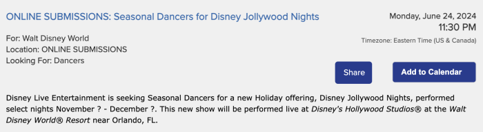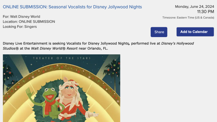 However, the casting call does also say that this is a “brand new” stage show, so it’s very possible the show may be different from the 2023 version. There are two casting calls currently active through Monday, June 24th at 11:30PM — one for vocalists and one for dancers!