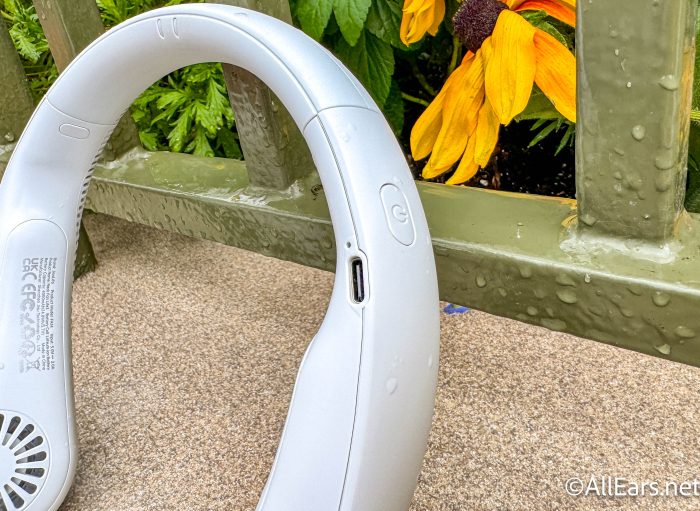 So we recently tried out two of the neck fans that we often recommend from Amazon. A neck fan is a WONDERFUL thing to have in Disney World because keeping that air circulating on your neck really does help you feel a lot cooler. We started with the ASNUG fan, which we charged for a little bit with a USB-C charging cable (which both fans come with) before we hit the parks.