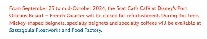 You can typically find a fun selection of jazzed up beignets, coffee, and other beverages at this quick service café outside the lounge. However, suppose you’re planning on grabbing a New Orleans-style beignet and coffee from September 23rd to mid-October. In that case, you’ll have to venture to Sassagoula Floatworks and Food Factory because Scat Cat’s Club — Café will be undergoing refurbishment.
