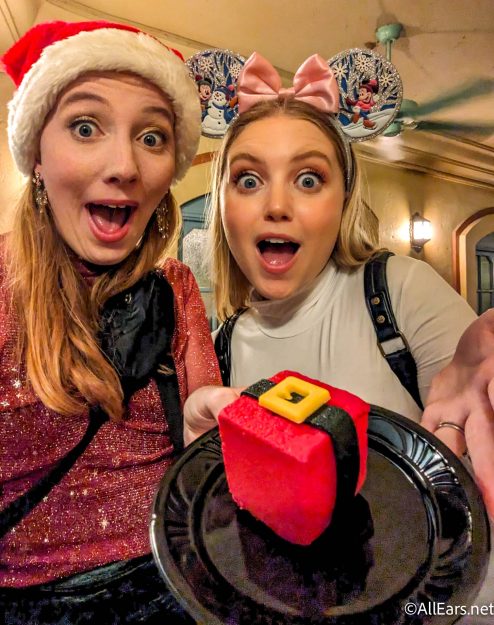 - Santa Belt Buckle: Pistachio mousse with a dark chocolate truffle center and a chocolate buckle (Available during Mickey’s Very Merry Christmas Party only)