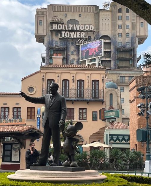 The famous Partners statue, with Walt Disney and Mickey Mouse, is dwarfed by the looming presence of the Tower of Terror in the Walt Disney Studios park. [Chuck Schmidt]