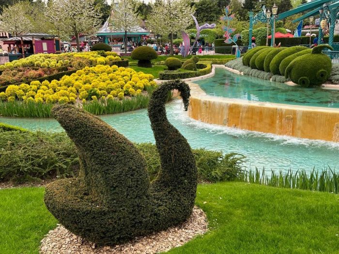 A swan topiary, beautiful floral displays and a gentle waterfall accentuate the beauty within Disneyland Paris. [Chuck Schmidt]