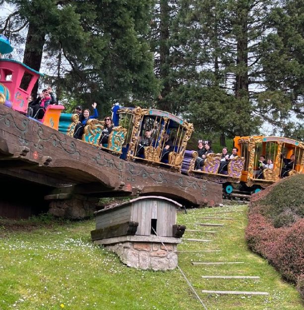 The Casey Junior circus train ride in Paris is known as le Petit Train du Cirque. Instead of traditional tracks, the train traverses on a tubular steel track for a smoother ride. [Chuck Schmidt]
