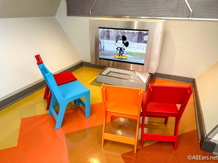 While you’re there, kiddos have their own designated area to watch Mickey shorts and hang out.