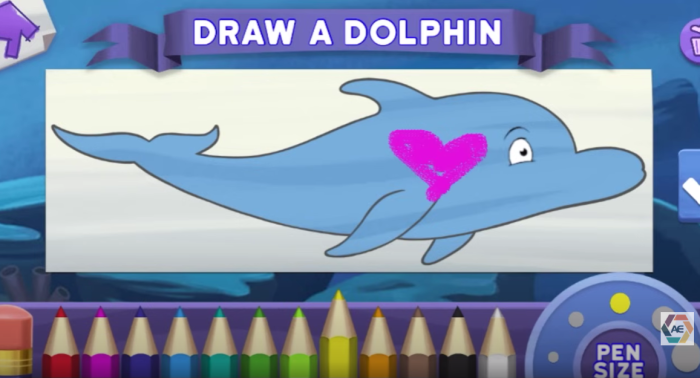 Then you’ll see the Art of Animation lobby and what your goal is: to draw some stories and characters to star in the show. So you need to go to the Art of the Animation lobby and follow the game’s directions. We had to draw a dolphin!