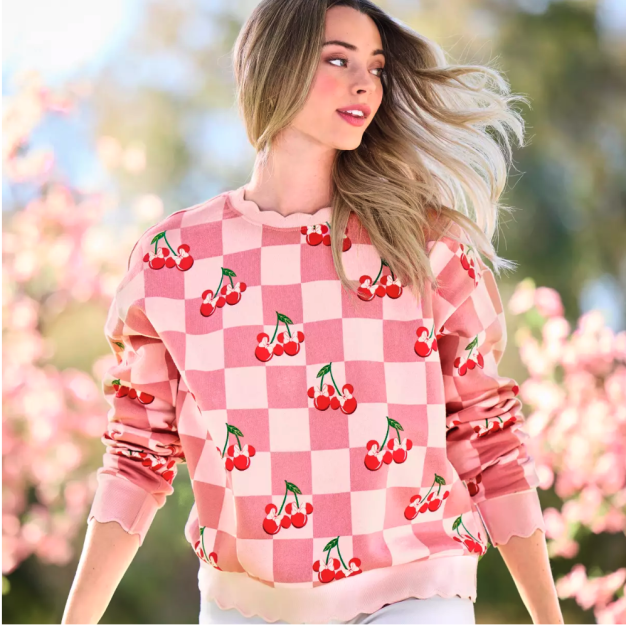 Looking at this sweatshirt is seriously satisfying. The Minnie Mouse cherries are too cute combined with the checkered background!