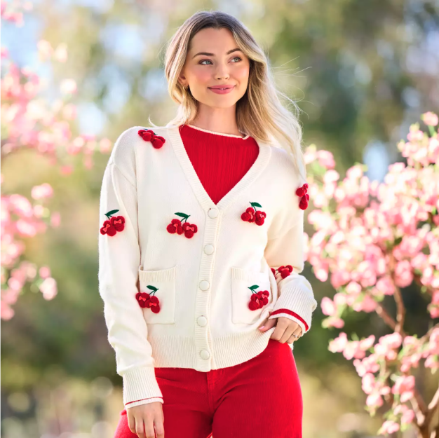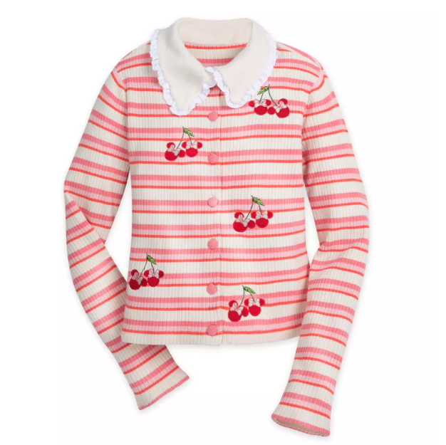 On every item in this collection, you’ll notice Minnie’s signature bow on the cherries. But we LOVE the 3-D Minnie Mouse cherries on this white sweater! It’s classic with a twist.