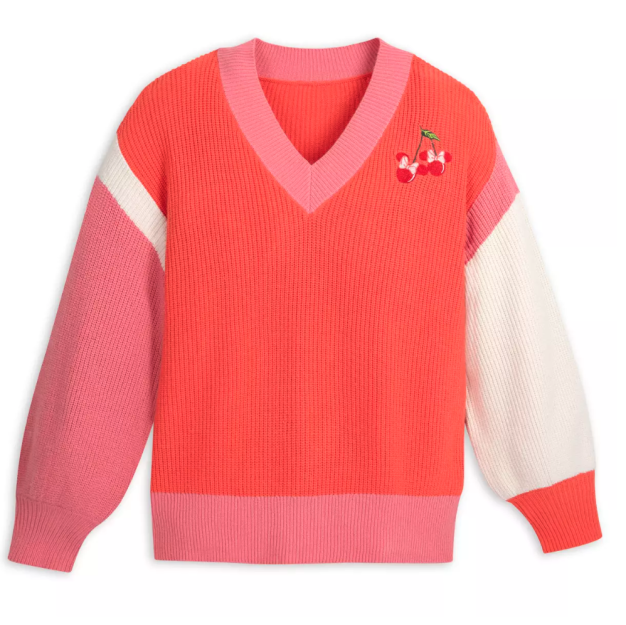If block colors are your thing, you’re going to love this sweater. It’s a fun combination of pinks and white and, of course, the Minnie Mouse cherries.