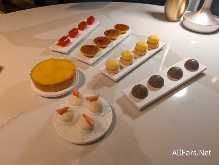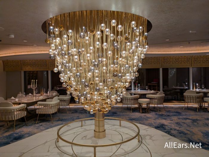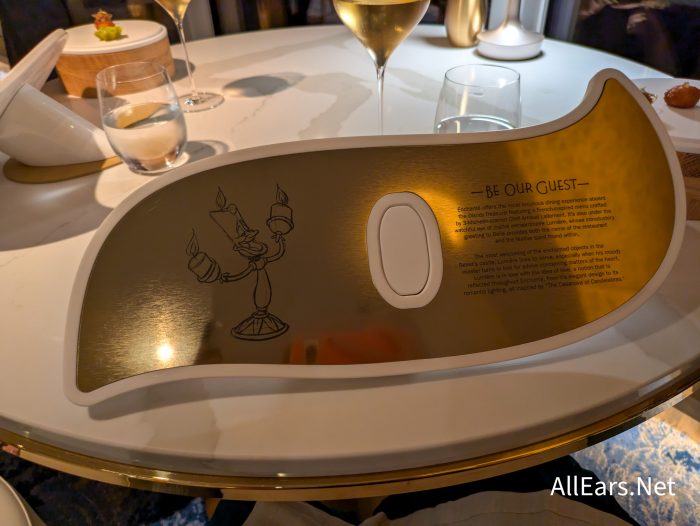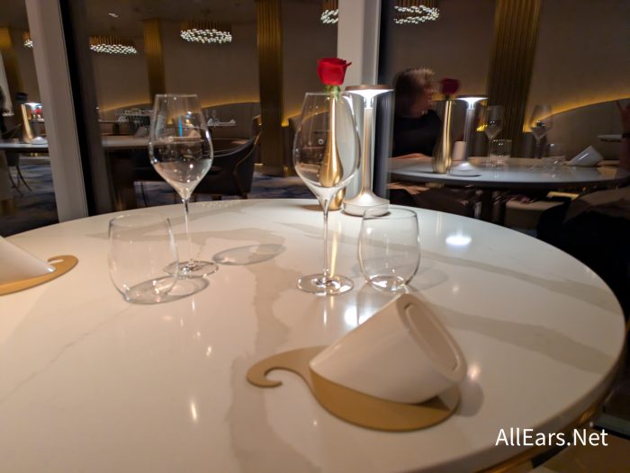 Welcome to Enchanté! The Disney Treasure’s adult-only dining spot inspired by Beauty and the Beast that serves up French-inspired cuisine. This dining spot is available on the Disney Wish and the Disney Treasure and we got to stop by on our first sailing aboard the Treasure! This gorgeous dining spot features nods to the iconic movie and is considered the highest form of fine dining on this ship.