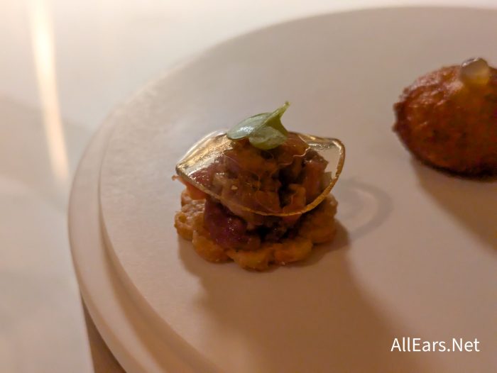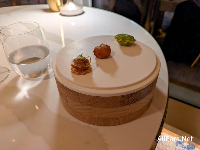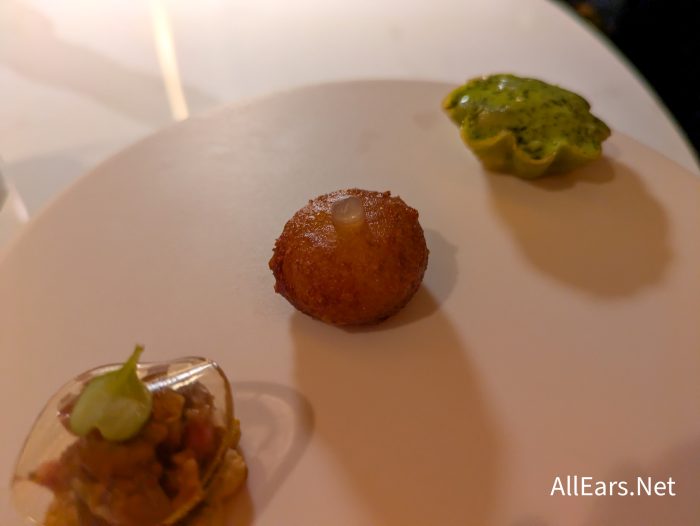 We started with three canapes! From front to back we had a beef tartare, croquette, and a sea bream tartar.