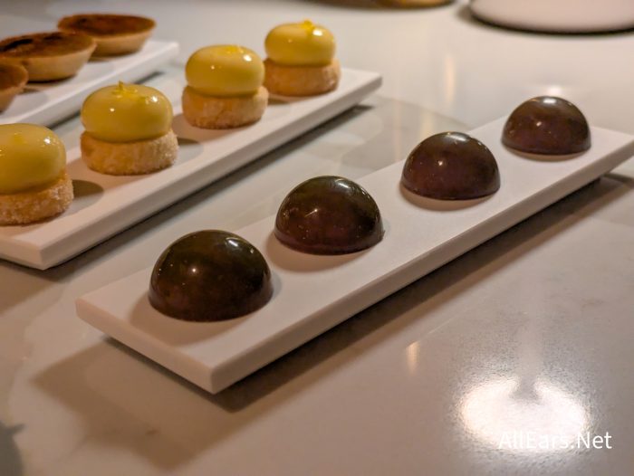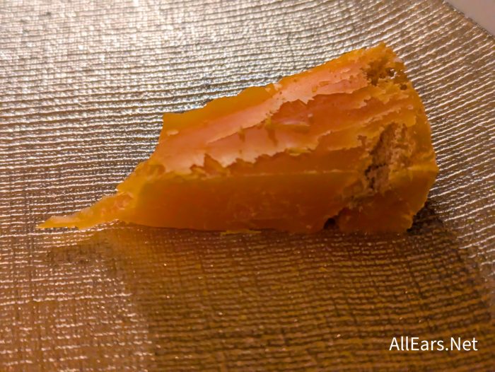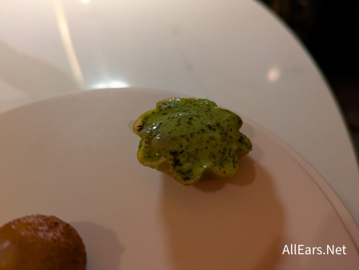 We were encouraged to enjoy these as finger foods and weren’t given plates. We started this course with the chocolate bonbon filled with pear and salted caramel. This was a delicious bite that was not as chocolatey as we initially expected. The burnt flavor of the salted caramel shined through here.