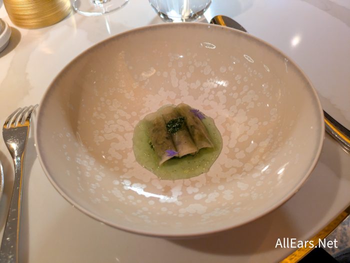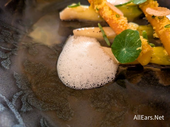 There was an explosion of flavor here that was strong and aromatic. It was delicious but you wouldn’t want more than the three bites provided. It’s the perfect way to whet your appetite before the first course. Our first course was leeks braised in vegetable stock with an egg yolk wrapper filled with egg yolk foam and topped with freshly grated egg yolk and finished with champagne cream foam.