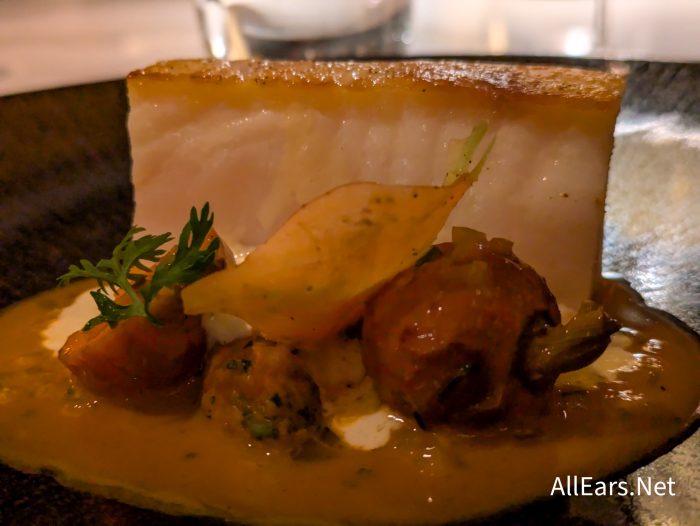 This dish was poached chicken, watercress coulis, ravioli with Kalamata olives, pork fat, black trumpet mushroom, hazelnut, and parmesan condiment with a chicken curry sauce. The poached chicken was so tender and well-seasoned.