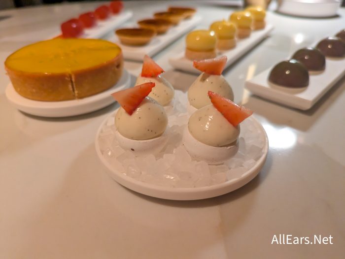 We were getting full but couldn’t stop here! We tried mini pavlovas with meringue, strawberry, and a whipped vanilla ganache. Despite being so full we had to eat two! The meringue and whipped ganache textures were light, airy, and perfectly balanced. With the strawberry adding a ton of flavor it was basically the most elevated strawberry shortcake we’ve ever encountered!