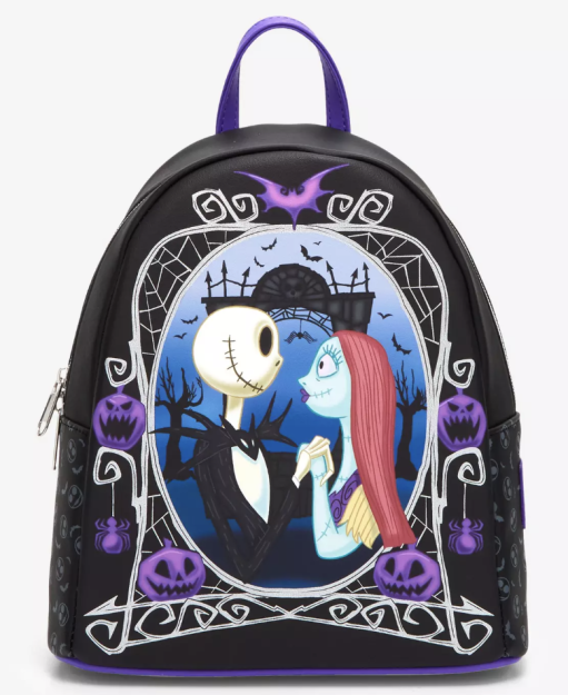 Halloween Town’s spooky sweethearts look absolutely smitten with each other in this Loungefly backpack’s design! This mini backpack from The Nightmare Before Christmas features Jack & Sally holding hands and framed by purple pumpkins and critters. We can’t imagine a more perfect framing for these two!
