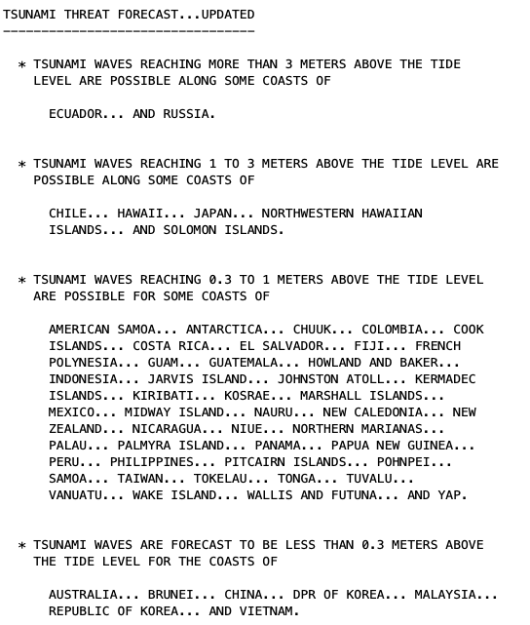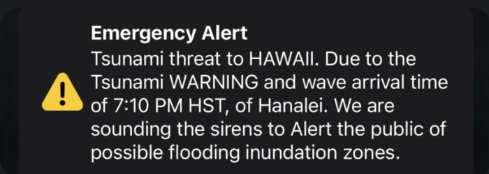 A tsunami warning has been issued for Alaska’s Aleutian Islands and Hawaii, and a tsunami advisory has been issued for California, Oregon and Washington. Guam is under a tsunami watch. According to Oahu Emergency Management, destructive waves are expected to arrive later tonight. Currently, tsunami sirens are going off on all Hawaii islands as a part of their statewide warning system. They will continue to go off ten minutes after the hour for the next three hours to continue warning people to prepare. People in coastal areas are urged to evacuate immediately as all shores of the islands are at risk of being affected.