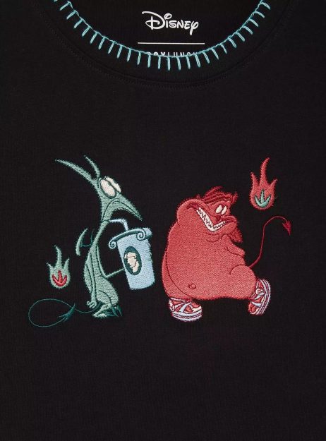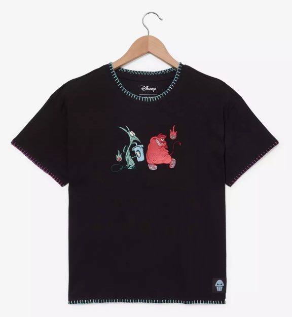 This one’s for the moms who grew up on VHS Disney and can still quote every line from Hercules. Pain and Panic—aka Hades’ chaotic little henchmen—get the spotlight here, embroidered right across the top of the tee. The rest of the shirt is decked out with a woven skull tag (because of course), and even the hem and collar have that extra pop with a blanket stitch finish.