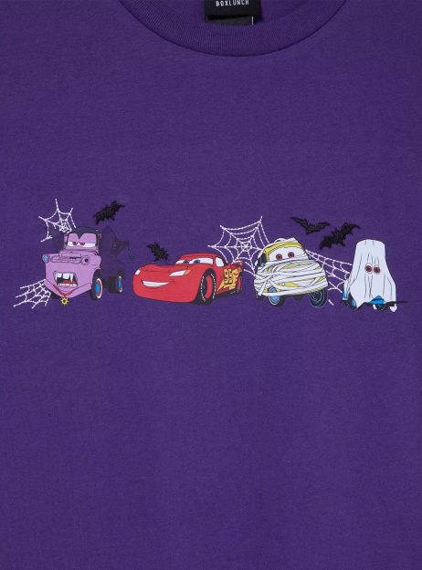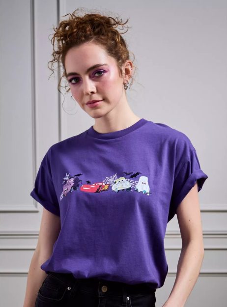 Halloween in Radiator Springs? Sign us up. This t-shirt features Lightning McQueen, Mater, Guido, and Luigi dressed in full Halloween looks—and yes, it’s every bit as adorable as it sounds. There’s embroidered webs and tiny bats on the shirt to give it some extra flair, which means it’s not just printed—it’s textured and detailed in a way that makes it feel special.