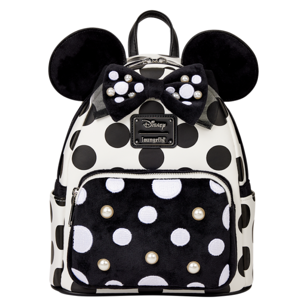 This 9″W x 10.5″H x 4.5” D exclusive mini backpack is covered in black and white polka dots. You’ll find 3D Minnie Mouse ears sticking up from the top. Between them, you’ll find an extra charming take on her classic bow – this one is velvet with faux pearls and a tulle accent! You’ll find more faux pearls on the front pocket!