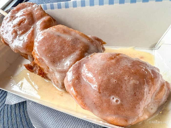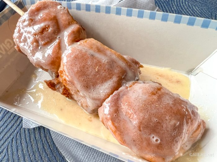Available right now at the Blue Ribbon Corn Dogs stand on Disney’s BoardWalk is the new Fried Hawaiian Rolls. These are three King’s Hawaiian Rolls fried on a skewer, rolled in cinnamon sugar, and drizzled with condensed milk! It’s $10.99, and WOW, the price is worth every penny.