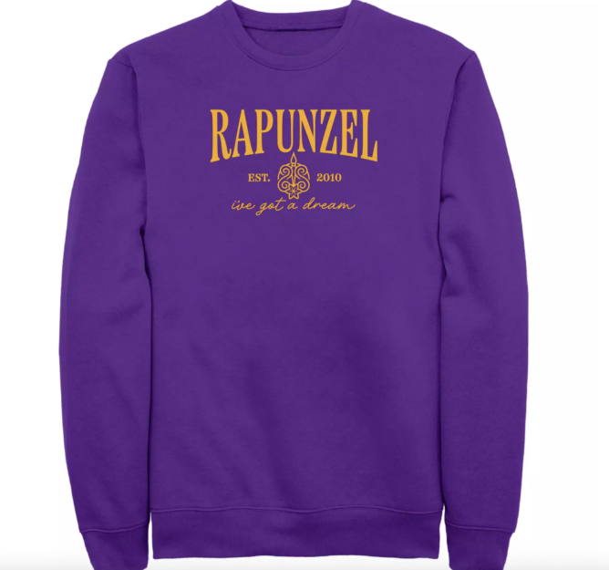 Okay, how cute is this?! This embroidered shirt says ”Rapunzel,” ”Est. 2010” and I’ve got a dream” to show off your love for Tangled. It also has an embroidered paintbrush and sundrop flower. It has long sleeves, a warm knit fabric, and a ribbed crew neck.