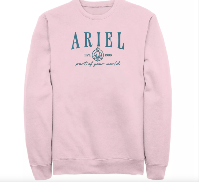 This shirt screams, “But Daddy, I love him!” It’s a soft pink with a teal blue writing that says “Ariel”, “est. 1989”, and “part of your world.” It has an embroidered icon like a seashell and a trident. It’s a warm knit fabric with a fleece interior.