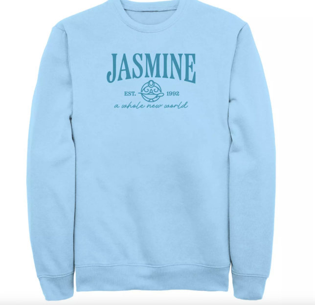 This baby blue sweatshirt features teal writing and designs that say ”Jasmine,” ”Est. 1992” and ”A Whole New World.” It also has an embroidered magic lamp (no genie included, sadly). It also has a warm knit fabric, long sleeves, and a fleece fabric interior.