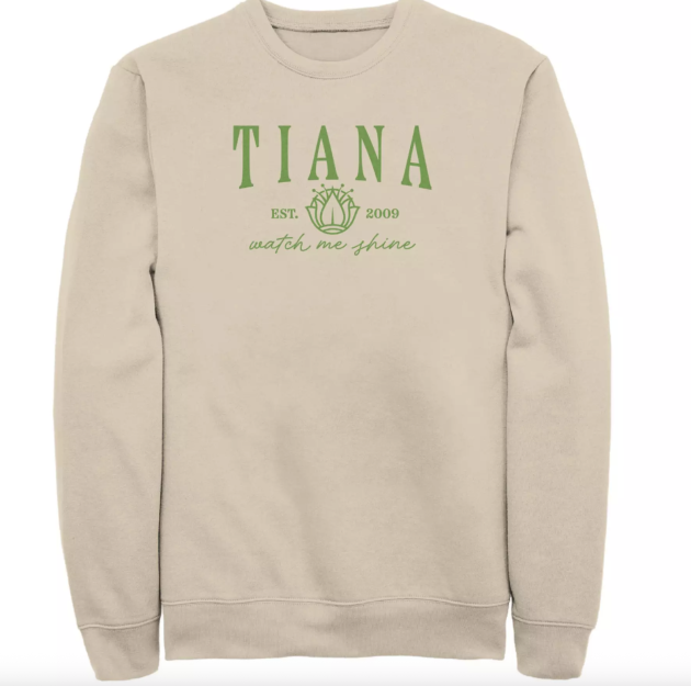 It’s a cream colored top with green writing that says ”Tiana,” ”Est. 2009” and ”watch me shine!” There’s also a beautiful water lily in the center for any frogs nearby to enjoy. Just like the others, it’s long-sleeved and has a fleece lining interior.