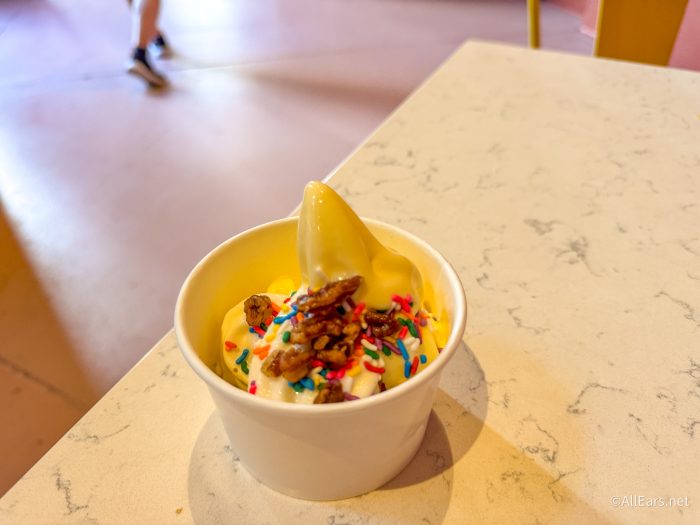 This created an almost tropical cheesecake flavor, which we were big fans of. The Dole Whip was regular Dole Whip, but we do feel it wasn’t as creamy as it could have been. Thankfully, the frozen yogurt more than made up for that!