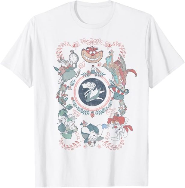 This Alice In Wonderland Card Style Mashup T-Shirt is available on Amazon in all sorts of fits, styles, and colors. The shirt features characters from the beloved animated film, such as Alice, the Cheshire Cat, the White Rabbit, the Queen of Hearts, and more!