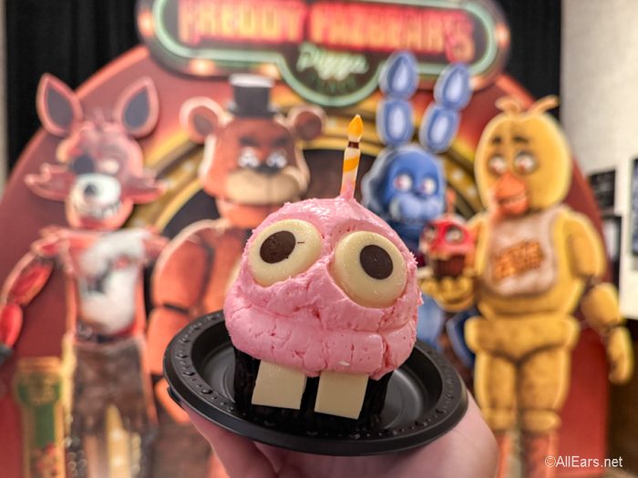 So for Halloween Horror Nights, Louie’s Italian Restaurant has been transformed into Freddy Fazbear’s Pizzeria, the very same pizza place you visit in the Five Nights at Freddy’s video game and movie. And one of the snacks there is Carl Cupcake, who is actually a character from the game and movie. But at Halloween Horror Nights, he’s a cupcake you can eat.