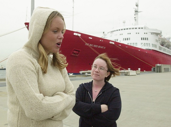 Who are these two women and why are they looking perplexed near a big, red ocean liner?