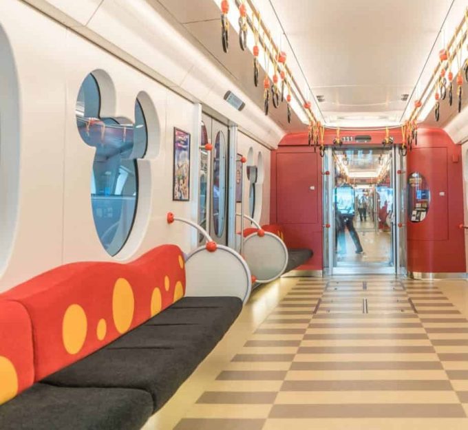 It sure looks spacious and clean and there’s a strong Mickey Mouse influence throughout. When you ride it, you get from Point A to Point B in style and comfort, thanks to those cushioned seats.