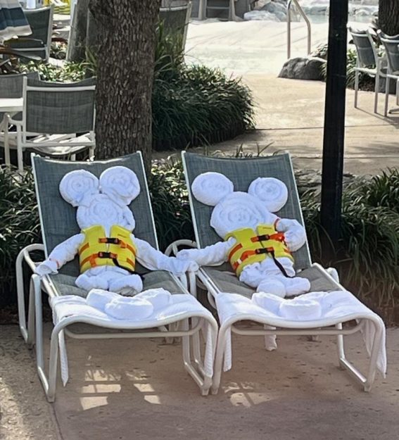 As you can see, they’re all set for a day at the pool. They’re both wearing floatation devices and they have plenty of towels to dry off after swimming. There are even a few not-so-hidden Mickeys on their lounge chairs.