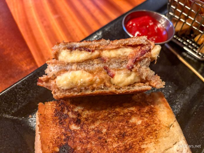 This is 100% for everyone who grew up on banana and peanut butter sandwiches. It’s filled with gooey peanut butter, soft bananas, crispy bacon, and then sandwiched between two beautifully done pieces of bread. However, it could likely be too sweet for a lot of people — it felt a bit more like a dessert to us!