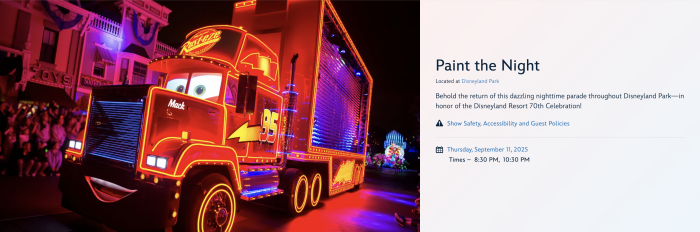 The Paint The Night parade returned as part of Disneyland’s 70th Anniversary Celebration — the anniversary is expected to run into sometime in 2026. Before that, Paint The Night was last seen as part of Disneyland’s 60th Anniversary Celebration a decade ago.
