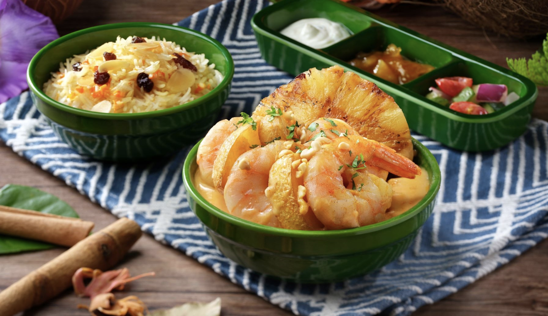 - Massaman Prawn Curry with Gramma’s Signature Rice and new potato, pineapple, peanuts, carrots, basmati rice, almonds, and raisins