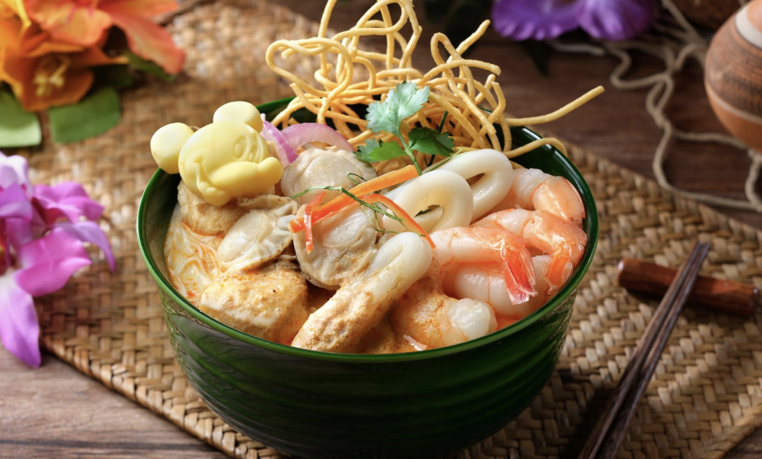 - Seafood Laksa Soup Noodle with shrimp, scallops, squid, rice noodles, crispy noodles, and a Mickey egg (MICKEY EGG!)