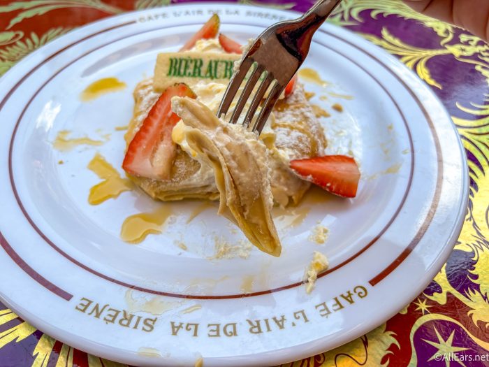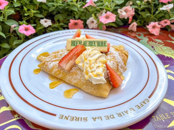 Café L’air de la Sirene is the quick-service restaurant in the land that serves up amazing French-inspired bites and drinks. We both love this spot, and for me, it’s my favorite place to end each night in the park with a drink. So what’s the thing we can’t agree on? The famous Butterbeer crepe!