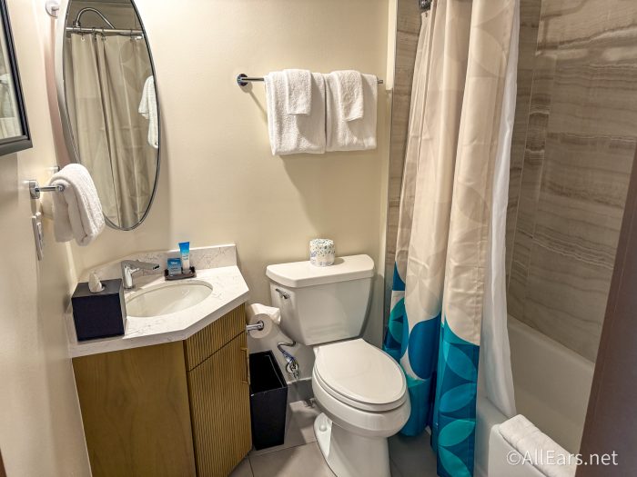 The other one has more Mary Blair-style artwork. This bathroom is smaller, but it features a sink with storage underneath, as well as a bathtub and shower. Two showers make getting ready in the morning SO much easier, especially when you’re trying to run out the door.