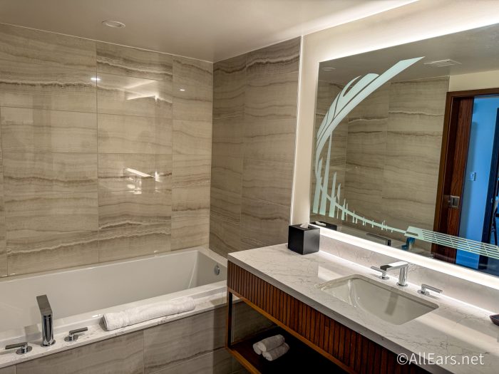 There are two bathrooms, one of which features references to the monorail. It’s similar to the bathrooms in the main Contemporary building, with plenty of counter space and a tub that looks so relaxing.