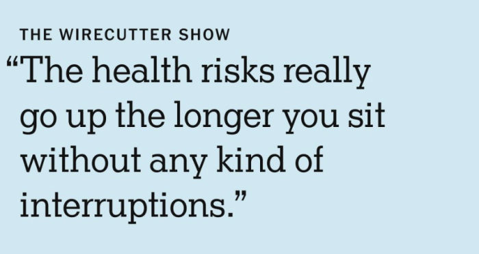 The Wirecutter Show recently interviewed the home office writer of the show, Arriana Vasquez, who talked about how working sedentary from home for more than 30 minutes can “increase the risk of chronic diseases, such as heart disease and diabetes, and contribute to pain in your muscles and joints,” and that you should find a way to schedule movement into your day at least every 30-60 minutes.